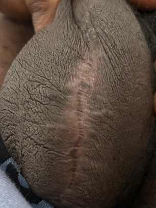 The patient was booked for elective excision under spinal anaesthesia. Intraoperatively, multiple calcified nodules were excised from the scrotal skin without breaching the tunica vaginalis or involving the testicular parenchyma. The skin was sutured with good cosmetic closure.