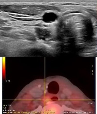 The patient remained disease-free for ten years until new symptoms and biochemical abnormalities reappeared (PTH 229.2 pg/mL, calcium 11.7 mg/dL). Cervical CT and 18F-choline PET-CT identified a hypermetabolic paraesophageal lesion (SUVmax 2.8, 6×7 mm) and three nodules in the upper right thyroid lobe (Figure 1).