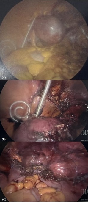The patient underwent exam under anesthesia, laparoscopic lysis of adhesions, total laparoscopic hysterectomy, and cystoscopy. The peritoneal dialysis catheter was located in the patient’s left lower quadrant and was prepared in the sterile fashion using chlorhexidine and remained on the surgical field. Upon entry, abdominal survey was notable for scarred white peritoneum and dense omental adhesions to the anterior abdominal wall in the area of her prior Cesarean incision and adjacent to the peritoneal dialysis catheter (Figure 1A & 1B). Adhesiolysis was performed without complication and the hysterectomy was otherwise completed without issue, with estimated blood loss of 100 mL, and final pathology showing a 238 g uterus with extensive adenomyosis and focal degenerative change. The vaginal cuff was closed laparoscopically with care to incorporate the peritoneum, as the plan was to eventually restart peritoneal dialysis, and laparoscopic port sites were closed in usual fashion (Figure 1C).